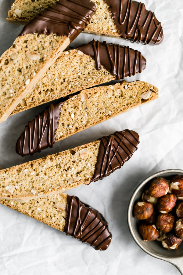 Dark chocolate. Melted dark chocolate makes the perfect topping for these hazelnut biscotti. Everything is better with chocolate and these cookies are no exception. You can drizzle, dip or dunk the cookies into the melted chocolate and then top with more chopped hazelnuts or flakey sea salt if that’s your thing.