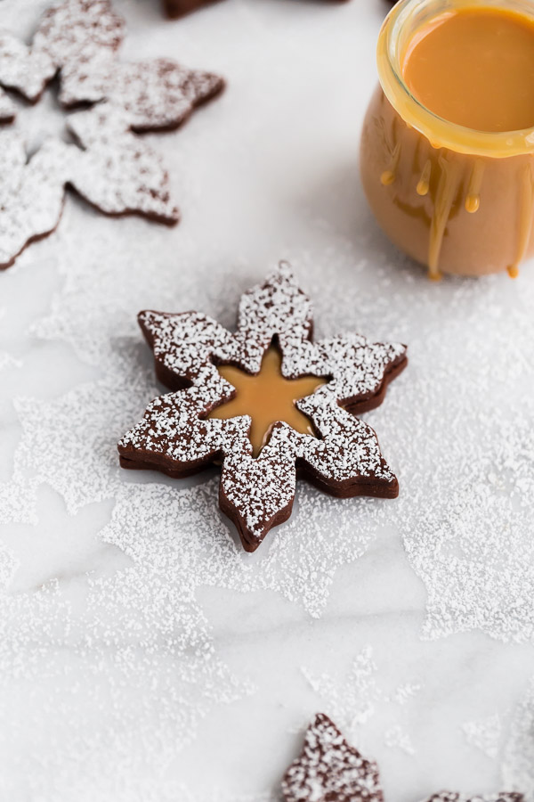 I couldn’t let cookie season pass us by without one last sandwich cookie perfect for your holiday celebrations. These festive, snow dusted gems are ready to dazzle the crowd at your next dinner party or Christmas cookie swap. They’re almost to pretty to eat. They are truly as delicious as they are beautiful and these beauties are more than just a cookie. These goodies deserve full dessert status if you ask me. Imagine two chocolate shortbread-like cookies with a hint of mocha flavor stuffed with a luscious layer of sweet dulce de leche. Words cannot explain just how much you are going to love this cookie. You’ll just have to bake a batch and see for yourself.