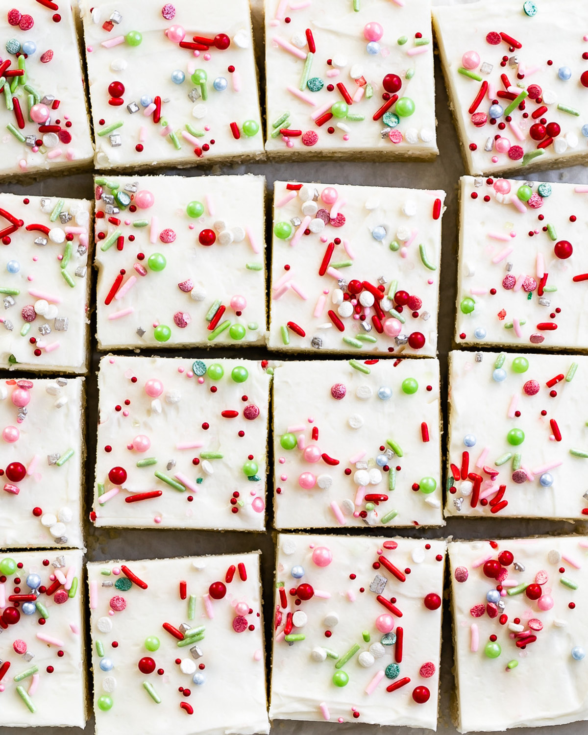It’s the holidays and we’ve all got too much going on to be scooping cookie dough all day which makes these simple sugar cookie bars my go-to for a speedy sweet tooth fix. Just bake the dough in an 8 x 8 pan, cover generously with a layer of smooth and creamy cream cheese buttercream, and top with a heavy dose of rainbow sprinkles. Tah-dah, dessert is served!