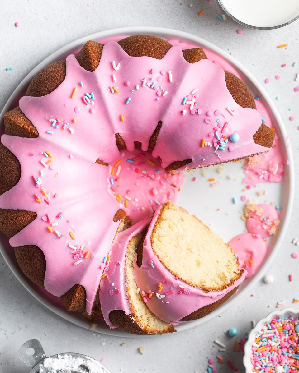 - Master the flip! Getting your bundt from the pan to the serving dish is a cinch if you follow two simple steps. First, allow the bundt to cool in the pan (on a cooling rack) for 10 minutes exactly. Set your timer once the cake comes out of the oven and don’t wait more than 10 minutes to remove the cake as you will risk it sticking to the pan. Place a cooling rack or serving plate across the top of the bundt pan and holding tightly, flip it over in one quick motion to release. Second, if it does not fall from the pan immediately in one whole piece, turn the pan back over and allow it to cool in the pan for a few more minutes. Repeat the flip and tap the bottom of the pan firmly to help release the cake. If your cake comes out with a few missing pieces stuck to the bottom of the pan, don’t despair. The cake will still taste AH-mazing and you can hide anything under a thick layer of pretty pink frosting and sprinkles!