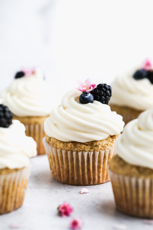 If these little cupcakes don’t scream spring loud and clear, I’m not sure what does. Topped with fresh berries and a tiny blossom straight from the garden, decorating this dessert could not be easier!!